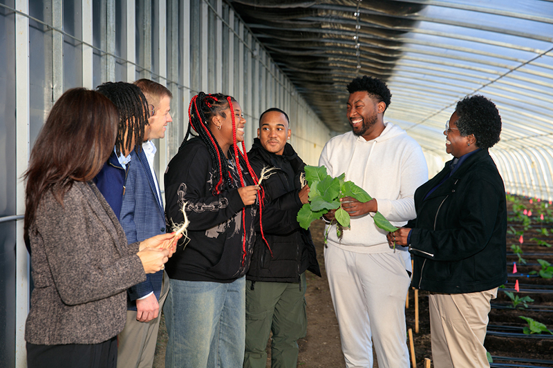 CoBank's Ryan Sandoz, Relationship Manager (third from left), and LaTonya Keaton, Regional Vice President (far right), join Danforth Center colleague Antonio Brazelton with students at the Jackie Joyner-Kersee Food, Agriculture & Nutrition Innovation Center.