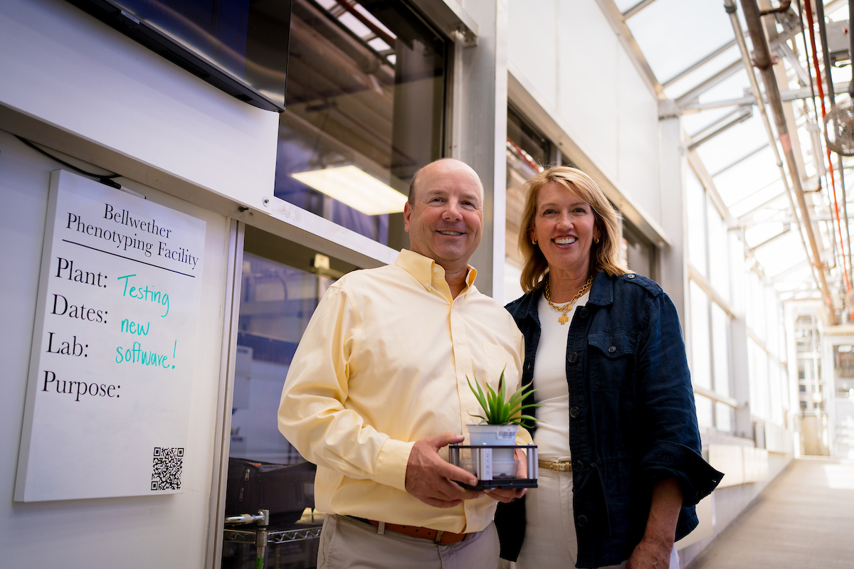 Now, with a transformational $5 million commitment to the Future Forward campaign, the Foundation is expanding phenotyping capability to the field. The new Bellwether field phenotyping facility, under construction at the Center’s 140-acre Field Research Site, will bring advanced imaging outdoors—creating a one-of-a-kind environment to test crops under real-world climate variability. Already in 2025, the facility supports breakthrough research in sorghum, corn and soybean, and perennial crops, while training the next generation of phenotyping experts.