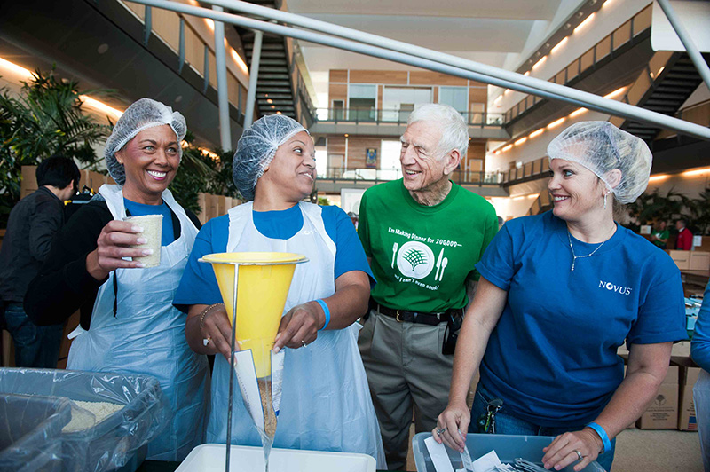 Bill Danforth helping teams prepare donation packages at World Food Day, a Center tradition in the early years.