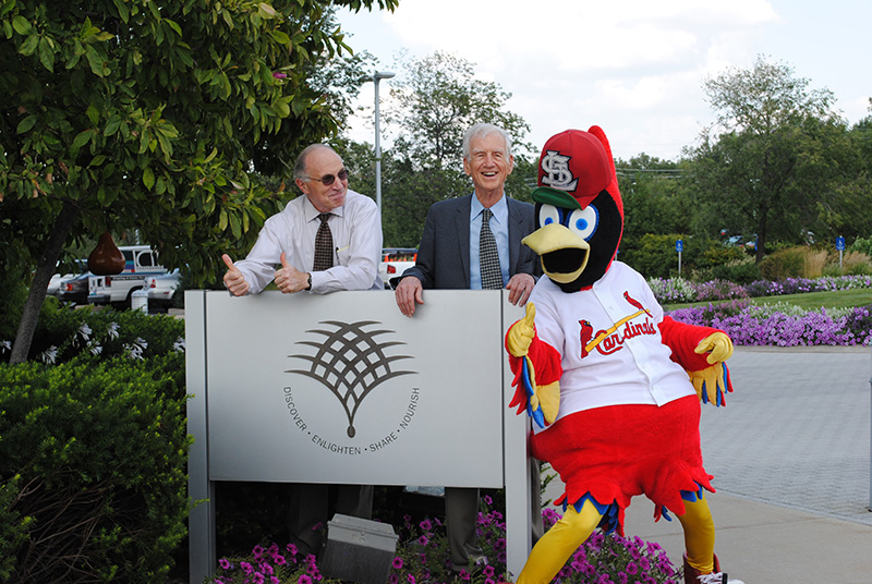 Bill Danforth with Interim President Phil Needleman and Cardinal’s mascot Fredbird.
